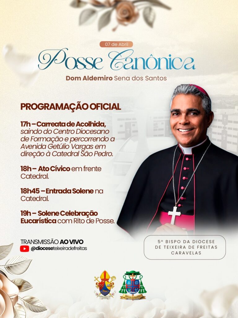 A Diocese de Teixeira de Freitas – Caravelas divulgou a programação oficial da Posse Canônica de Dom Aldemiro Sena dos Santos, 5º bispo diocesano, marcada para o próximo dia 07 de abril, na Catedral São Pedro. O momento promete reunir fiéis, autoridades e todo o povo de Deus em uma celebração histórica, marcada pela fé, comunhão e esperança.